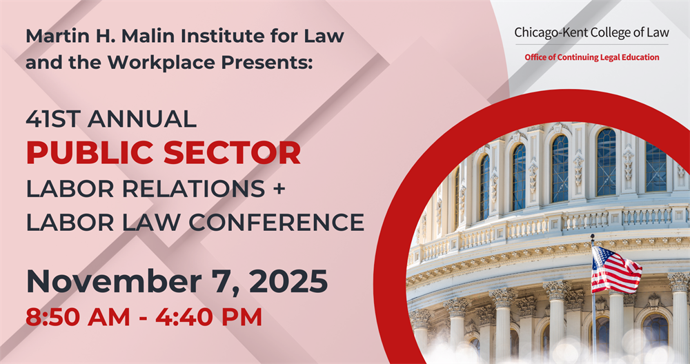 Join us for the 41st Annual Illinois Public Sector Labor Relations & Labor Law Conference, hosted by Chicago-Kent College of Law and the Martin H. Malin Institute for Law & the Workplace. This year’s event will open with a plenary session on the impact of recent presidential Executive Orders and federal funding shifts on public sector labor relations and collective bargaining. The discussion will feature Professor Robert Bruno, Director of the Labor Education Program at the University of Illinois; James Daniels, Deputy Director of the Labor Relations Bureau at the Illinois Department of Central Management Services; and Michael Newman, Deputy Director of Illinois Council 31 of AFSCME. Attendees will also hear updates from both Illinois public sector labor boards and can choose from a variety of breakout panels on topics including mediation and arbitration, education, DEI, legislative changes, federal grants, and more.